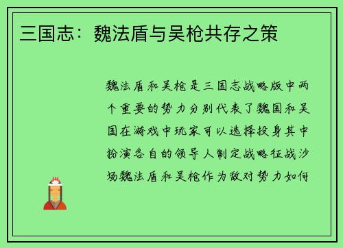 立即咨询魏法盾和吴枪是《三国志战略版》中两个重要的势力,分别代表了魏国和吴国。在游戏中,玩家可以选择投身其中,扮演各自的领导人,制定战略,征战沙场。魏法盾和吴枪作为敌对势力,如何在游戏中实现和平共存呢?本文将从多个方面进行阐述。