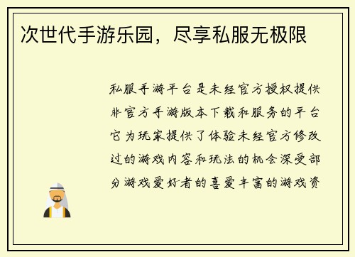 立即咨询私服手游平台是未经官方授权,提供非官方手游版本下载和服务的平台。它为玩家提供了体验未经官方修改过的游戏内容和玩法的机会,深受部分游戏爱好者的喜爱。