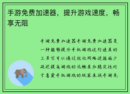 手游免费加速器是一种能够提升手机游戏运行速度的工具,它可以通过优化网络连接,减少延迟,提高游戏的流畅度和稳定性。对于喜爱手机游戏的玩家来说,手游免费加速器可以带来更好的游戏体验,让他们在游戏中畅快淋漓地战斗。