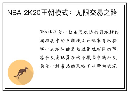 NBA 2K20王朝模式中的随便交易是一个非常有趣和有挑战性的策略。通过选择适合的球队、评估球队需求、寻找交易目标、制定交易策略、进行交易和评估交易结果,可以在游戏中获得更好的球员和资源,提升球队实力。希望本文的介绍可以帮助玩家更好地进行随便交易,享受游戏的乐趣。